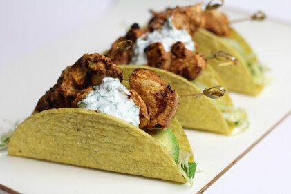 Meanwhile, heat the taco shells according to the packet instructions. Fill each with the combined lettuce and coriander and sliced avocado. Top with 2 skewers. Drizzle with combined topping mixture. Serves 4.