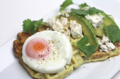 Serve 1-2 waffles per person. Top with the feta cheese, avocado and poached eggs. Combine the dressing ingredients and drizzle over the top. Can be garnished with coriander leaves and black pepper. Serves 4.