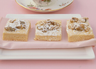 Place the ball between 2 sheets of waxed or baking paper and roll out to about 1cm thickness. Cut into squares or bars and place on a baking paper-lined baking tray. Sprinkle with the walnuts, pressing in lightly. Dust with half the icing sugar.
