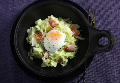 Lightly poach the eggs in simmering water. Serve the cabbage mixture in two bowls making a small well in the centre. Using a slotted spoon, place the poached eggs in the wells. Season. Serves 2.