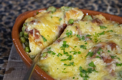 Edam cheese provides a nutty-flavoured topping. Broccoli florets could replace the peas.
