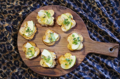 To make the topping, slice the gouda into 1cm-thick pieces to fit the crostini. Top each with an apple slice, a small dash of honey then garnish with micro greens. Serve within 30 minutes to prevent the crostini going soggy.