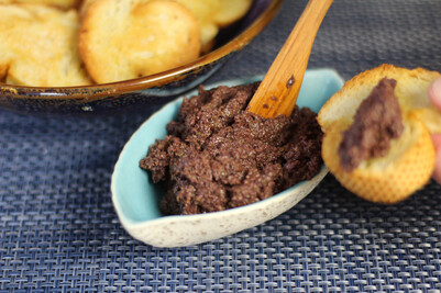 This tapenade makes a superb topping for crostini or crackers. There are 250g of drained olives in a 470g jar.
