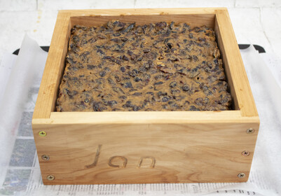 Butter a 20cm square wooden cake box well – especially in the corners. Place it on a baking tray covered with 4 layers of newspaper and 1 of baking paper. Or, grease and line the metal pan with two layers of baking paper.