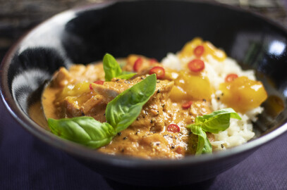 Shred or slice the turkey into smaller pieces. Add to the saucepan with the cream and yoghurt plus 1 tablespoon of the chutney. Heat through. Season with lemon juice. Serve topped with the remaining chutney. Serves 4.