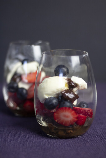 Top with the berries and ice cream. Melt the chocolate and cream together briefly in the microwave, then pour over the fruit. Top with whipped cream if using. Serves 2.