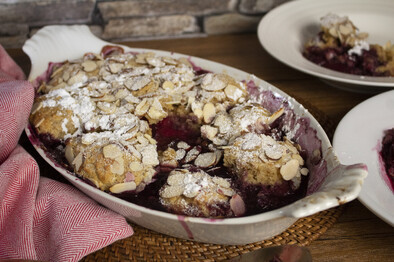Remove the plums from the oven. Drizzle with a 1/2 cup of the mulled wine then drop heaped tablespoons of the dough over the plums. Scatter the almonds evenly over the top.
