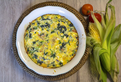 Whisk the milk and eggs in a bowl and pour over the corn mixture. Season.