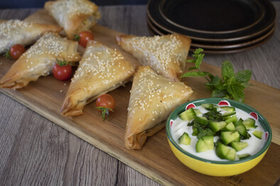 Brush 1 sheet of filo with oil and fold in half lengthwise. Place 2 heaped tablespoons of the mixture on the end of the filo. Fold the pastry over on the diagonal to form a triangle and cover the corn mixture. Continue folding the pastry over and over maintaining the triangle shape. Repeat with the remaining mixture and filo.