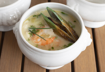 Serve in bowls, garnished with the reserved mussels in their shells and fresh herbs. Serve the lemon wedges on the side to squeeze into the chowder. Serves 4 as a main.