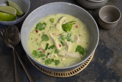 Stir in the chillies and half the coconut milk. Bring to a simmer, stirring. Add the remaining coconut milk and the stock, fish sauce and lime juice. Add the chicken and simmer on low heat for 8-10 minutes until the chicken is just cooked.
