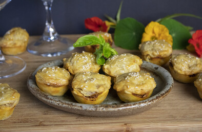 If you haven’t enough mini muffin pans, then bake the pies in batches. The pie tops can be sprinkled with sesame seeds before baking.