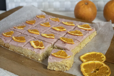 To make the icing, combine the icing sugar and melted butter. Add enough orange juice to produce a spreadable consistency. Spread evenly over the slice. Allow to set then cut into squares. Decorate as preferred. Makes 16 pieces.