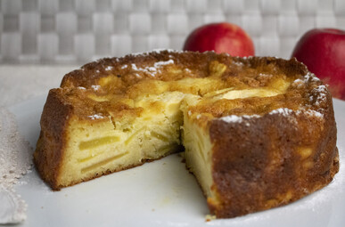 Beat the melted butter, sugar and condensed milk together in a very large bowl. Add the egg yolks and mix well. Fold in the ground almonds, cornflour and baking powder. Add the sliced apples. Mix well.