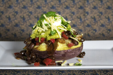 Lay the kumara halves — skin-side down — on a plate. Cut a cross in the flesh and squeeze the kumara to loosen the flesh. Spoon the bean mixture over the kumara then garnish with the toppings. Serves 4.