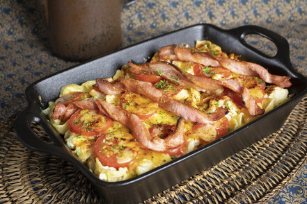 Add the sour cream, milk, mustard and 2/3 of the cheese. Stir over low heat until the cheese begins to melt. Tip into a baking dish. Top with the sliced tomatoes and sprinkle with the remaining cheese