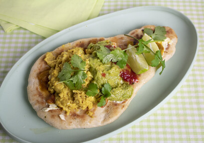 Meanwhile, lightly toast or grill the naans. Spread with the cream cheese. Top with the chutney, scrambled egg and avocado.