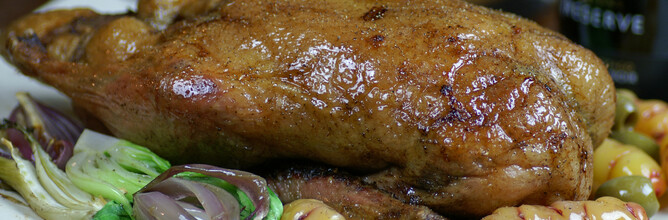 I purchased my duck from my local butcher but they are often available from delis or online. Reserve any duck fat drained from the roasting pan to roast potatoes at a later date. If fennel bulbs are unavailable, use celery and a few fennel seeds.2.1kg duck, thawed, any gible...