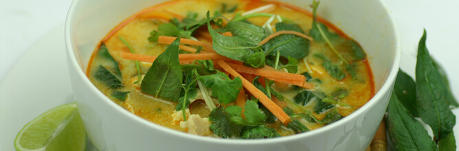 120g rice stick noodles1 tablespoon canola oil60g packet Singapore laksa spice paste1 1/2 cups chicken stock400g can light coconut milk300g skinned and boned chicken breast, thinly sliced1 kaffir lime leaf, julienned1/2 cup each: loosely packed Vietnamese mint leaves, corian...