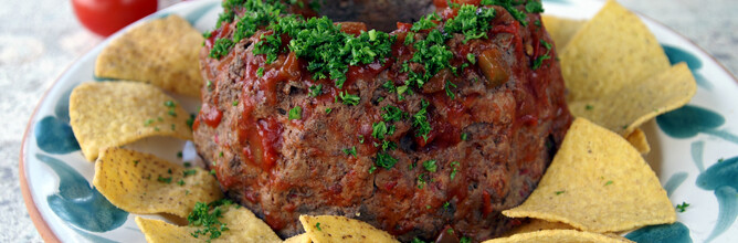 This recipe makes enough to serve two meals for four people. The loaf can be served hot or cold.1 small onion, quartered4 cloves garlic1 red pepper (capsicum) seeded and chopped2-3 teaspoons chilli paste or chopped chilli1kg lean minced beef1 cup fresh breadcrumbs1 large egg...