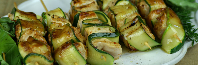 Marinade: 1/2 cup French dressing1 teaspoon each: sugar, chilli paste1/2 cup each: packed mint leaves, coriander leaves, finely choppedKebab: 500g skinned and boned chicken breasts3-4 courgettesWhisk the French dressing, sugar and chilli paste until well combined. ...