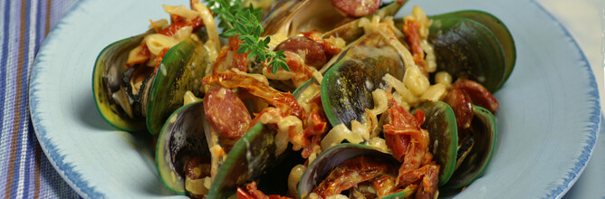 Scrub the mussels prior to cooking and remove the beards.1 tablespoon olive oil70g smoked chorizo, thinly sliced3 shallots, diced1/2 cup oil-packed sundried tomatoes, drained and julienned3 each: cloves garlic, crushed, thyme sprigs20-24 greenshell mussels in their shells1 c...