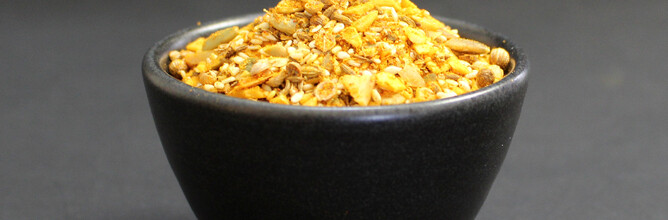 1/2 cup each: flaked almonds, sesame seeds, pumpkin kernels 4 tablespoons each: cumin seeds, coriander seeds2 teaspoons each: rock salt, oregano, fennel seeds1 tablespoon each: ground turmeric, paprika