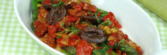 This topping complements numerous vegetables especially asparagus, courgettes, broccoli, beans, cabbage and Brussels sprouts.2 tablespoons olive oil4 sundried tomatoes, drained, patted dry and chopped4 each: pitted black and green olives, halved1 char-grilled red pepper, dra...